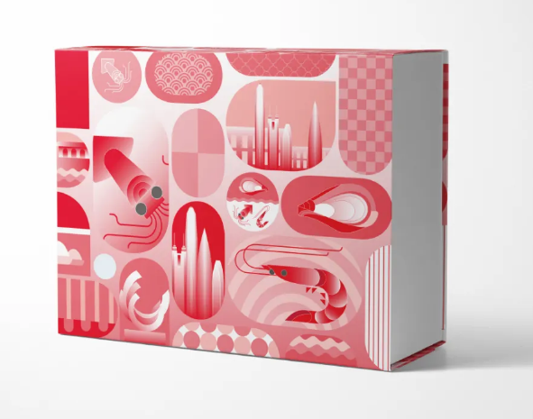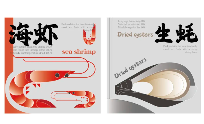 设计团队以“现代设计诠释原生海产”为核心,将虾干、鱿鱼干、生蚝干、瑶柱的形态拆解为纯粹的几何符号。整体视觉体系以红粉渐变为主色调,融合深汕合作区的海浪纹、深圳地标建筑群等元素,构建出“海产在海洋自由生长、愉快玩耍”的画面感,生动诠释“传统渔获与现代产业优雅交融”的深汕合作图景。